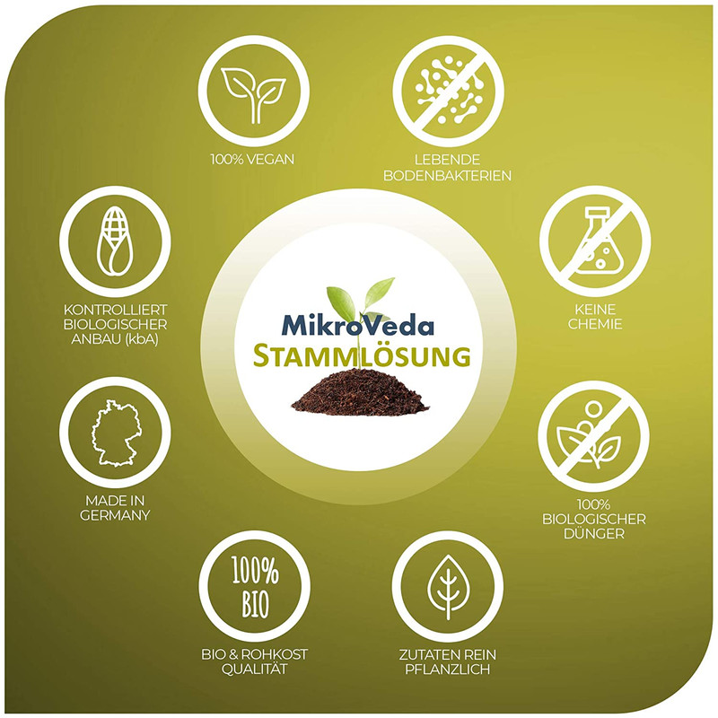 Du kannst diese Stammlösung mit Wasser verdünnt (für alle Anwendungen 1:100, Jungpflanzen 1:400) direkt verwenden oder, falls du größere Mengen benötigst, als Ausgangsprodukt für die Selbstherstellung von 33 Litern eines aktivierten Präparates. Du kannst  also selbst aus 1 Liter MikroVeda STAMMLÖSUNG und 1 Liter Zuckerrohrmelasse 33 Liter aktivieren und damit aufvermehren. Diese Lösung verdünnst du ebenfalls 1:100 bzw. 1:400 (Jungpflanzen) mit Wasser.
