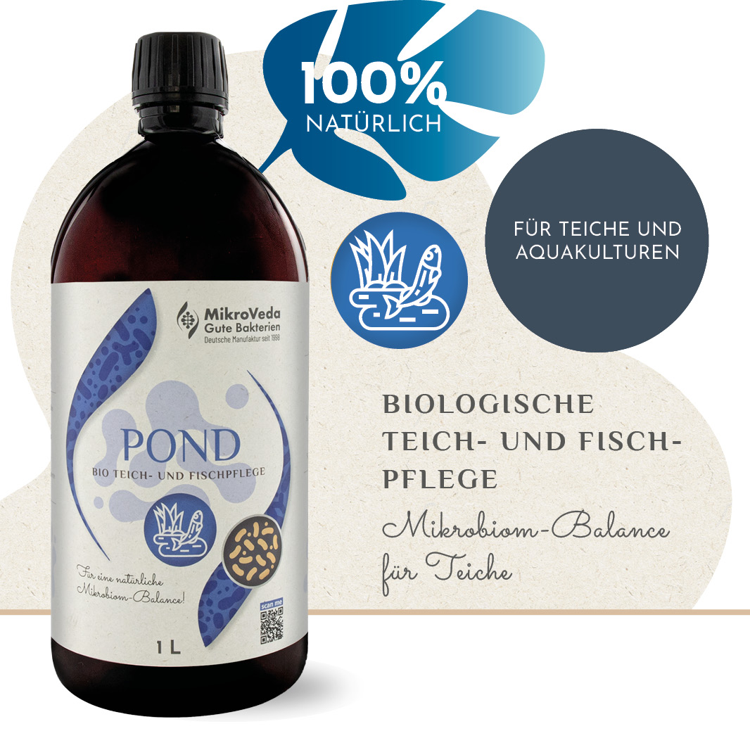 Teichwasser und Aquakulturen werden von vielen Substanzen belastet, wie beispielsweise von den Ausscheidungen der Fische, Futterresten, abgestorbenen Pflanzenteilen usw. Durch diese Einträge bildet sich ein Überangebot an Nährstoffen (Stickstoff, Phosphat). Die Folgen sind eine Verringerung des Sauerstoffgehaltes, ein übermäßiges Algenwachstum plus Faulschlammbildung. MikroVeda POND unterstützt die positiven Teichbakterien, fördert so die Selbstreinigungskräfte von Wasserbiotopen und pflegt gleichzeitig die Teichbewohner.