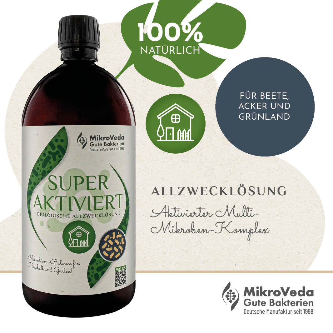 MikroVeda SUPERAKTIVIERT ist ein bereits aktivierter, vielseitig einsetzbarer Mulitmikrobenkomplex aus MikroVeda Mikroorgansimen. Das Präparat besteht aus nützlichen und ursprünglich frei in der Natur vorkommenden, nicht genmanipulierten Mikroorganismenstämmen folgender Gruppen: Milchsäurebakterien, Fotosynthesebakterien, Hefen, fermentaktiven Pilzen.