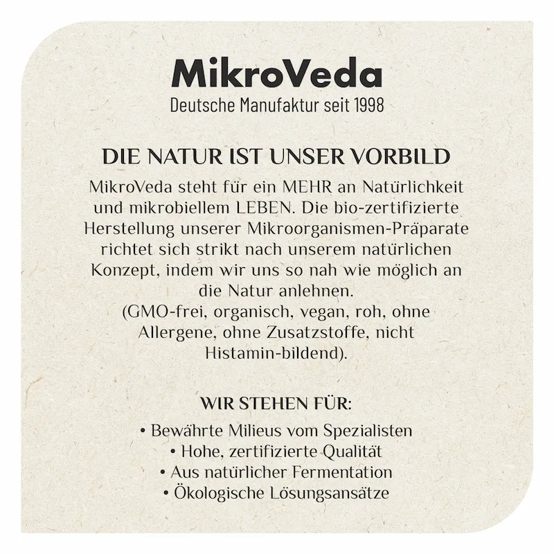 Die Präsenz von fotosynthetischen Bakterien in der Mikroorganismenkeramik ist der Grund dafür, dass sich die MikroVeda Waschkugel regelmäßig in der Sonne alle paar Monate "regenerieren" sollte. Die enthaltenen Mikroorganismen werden mit den Hartsteinen zusammen ganz nach japanischer Tradition in einer deutschen Manufaktur zielgerichtet gebrannt und können so ihre Wirkung dosiert abgeben. Die Fotosynthesebakterien verkapseln sich und trocknen zuvor lebend in die Keramik ein und werden inaktiv. Selbst in diesem inaktiven Zustand entfalten sie elektromagnetische Wellen, die auf die Hartsteine und von dort aus auf Wasser übertragen werden. Das Wasser wird energetisiert, vitalisiert und gleichzeitig werden die Wassercluster aufgebrochen. Dieser Vorgang kann sogar fotografisch nachgewiesen werden und ist für sensible Geschmäcker sogar im Wasserglas erkundbar.